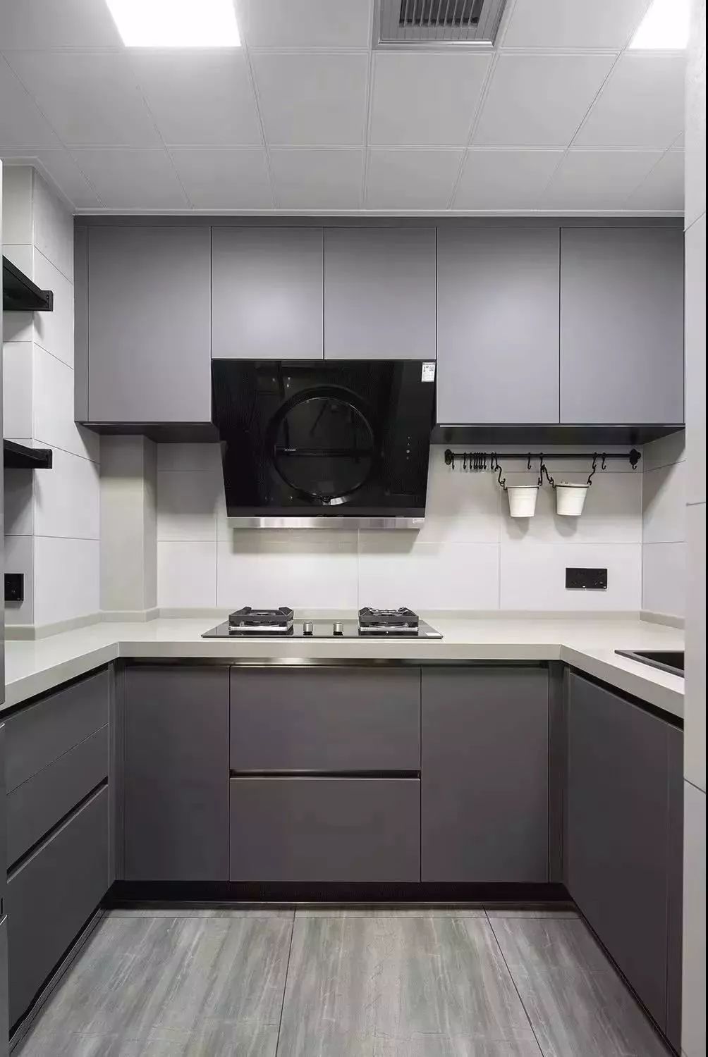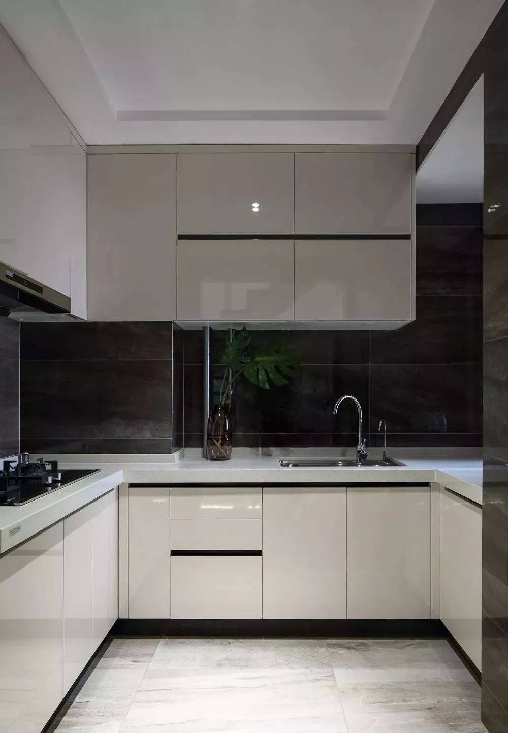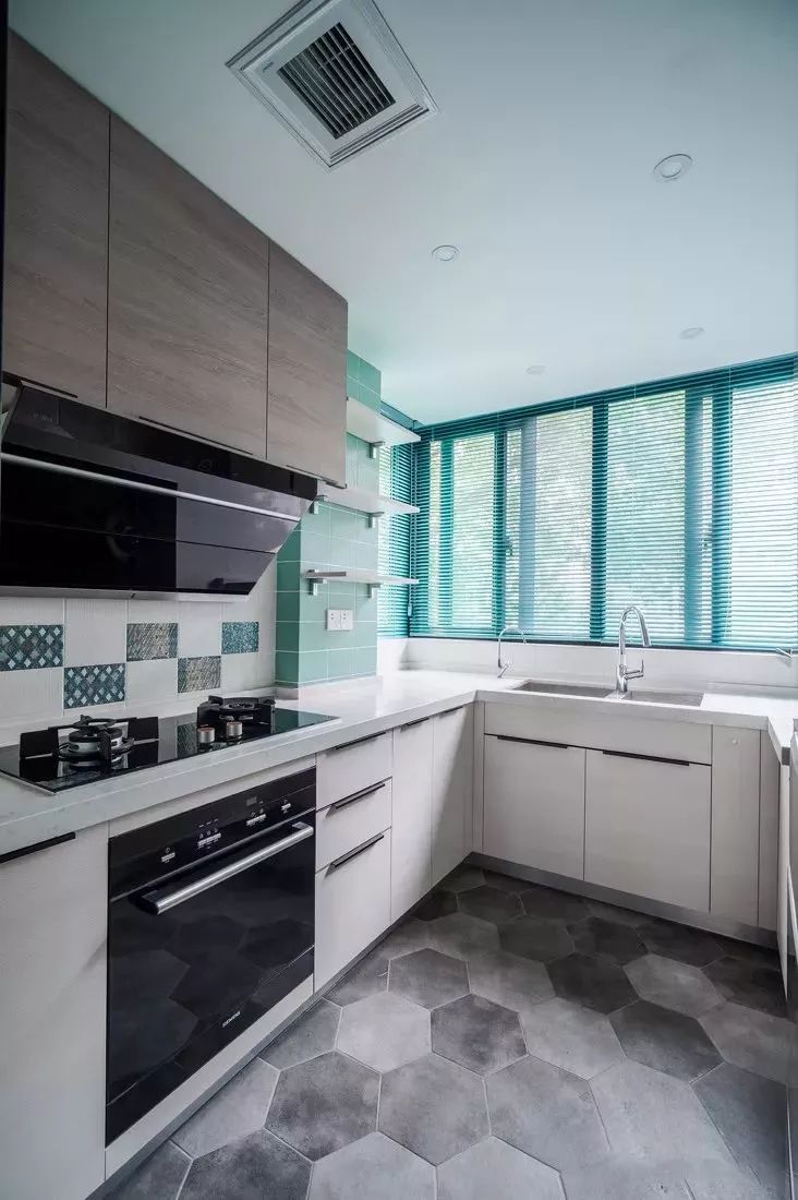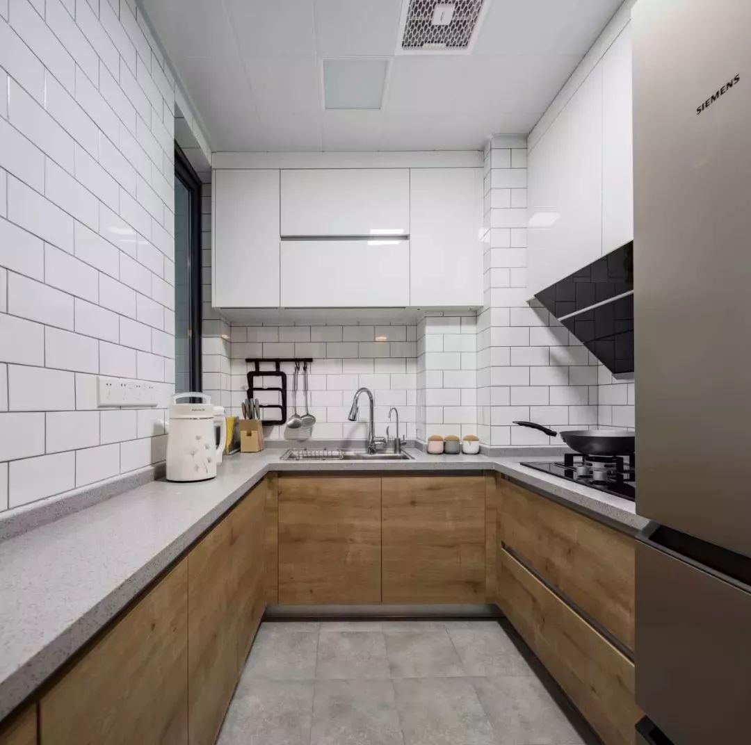 U型厨房应该是所有厨房布局中最为实用的一个设计,当你置身其中,三面挨着操作台,洗-切-炒-起锅的操作都在转身之间可以完成,非常的方便!