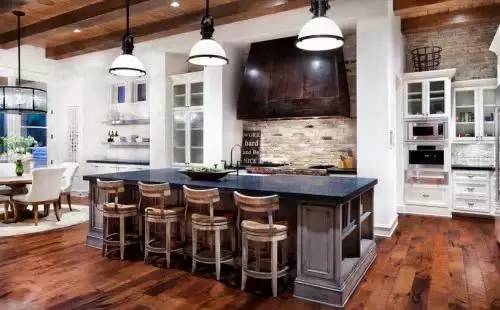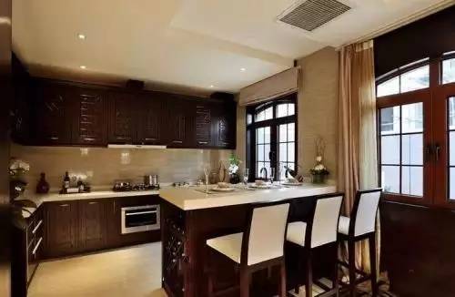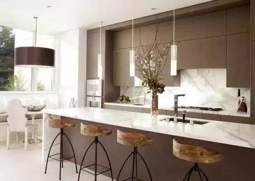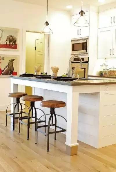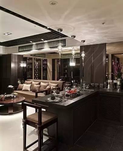 吧台总能在美观度和功能性上给你带来意想不到的效果,成为一道亮丽的风景线。开放式厨房的吧台,不仅在空间上起到分隔的作用,还可以当小餐桌,喝酒聊天,或者做为小工作区,看书办公。