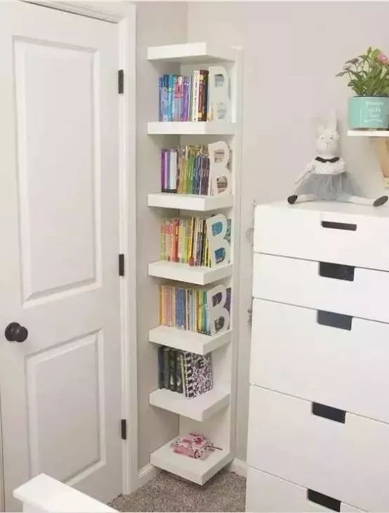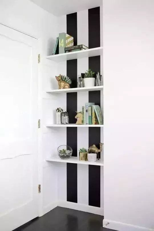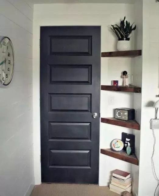 如果你觉得门上不喜欢挂着东西,门边又有柱子的,就可以像这样,做几个隔板,用来摆放各种装饰品和书籍。