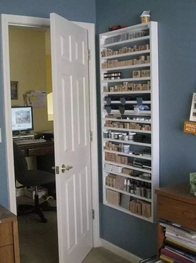 或者是直接在门后的墙面做一个置物架,稳固、不会撞到是重点,毕竟谁也不想东西摆上去天天都会掉下来~