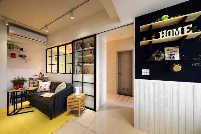 玄关进来右手边是客厅区,黑色沙发靠角落摆放,亮黄色的地毯为客厅增色不少,使客厅更加的活跃。