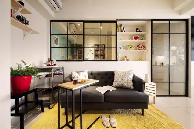 黑色铁艺茶几脚,旁边几个边几用来摆放绿植、随手物品等,完全能满足一个人的生活所需。