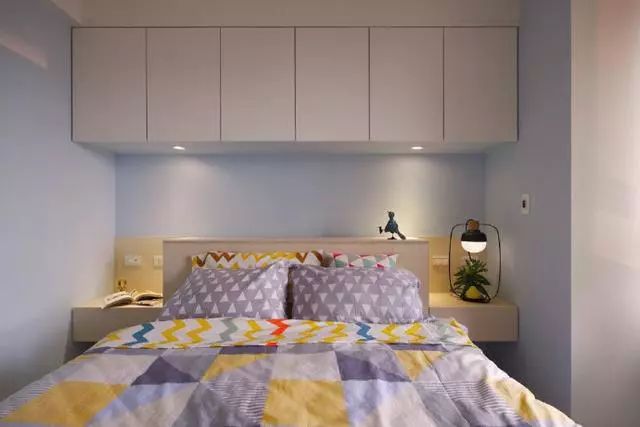 卧室,色彩多样的床品,床头墙上有一排柜子,小小的空间打造了充足的储物柜做收纳。