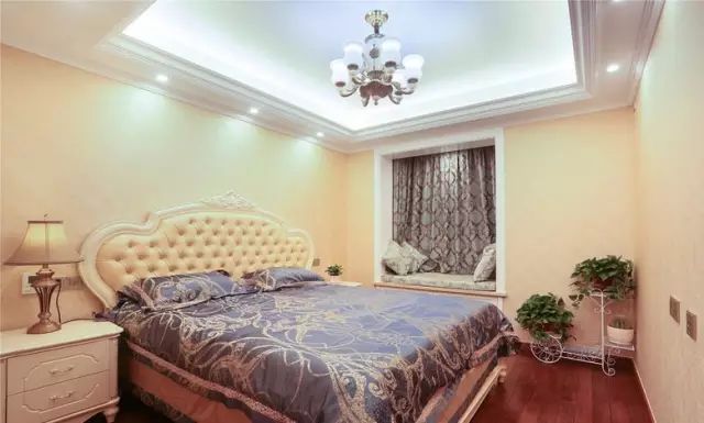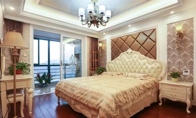 主卧,墙纸与软包的标配在红木地板的映衬下更显贵气,加上欧式大床和梳妆台,营造出简洁高雅的居室氛围。