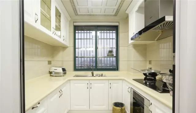 U型厨房设计,采用米色墙砖,很好的提升了厨房的亮度;搭配白色的橱柜整洁温馨。