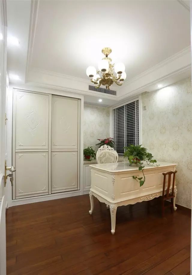 第三间卧室暂时改造成为小书房,布置了一张优雅的欧式书桌;考虑后期改儿童房,当然衣柜设计不能少,墙面置顶的衣柜,采用推移门节省空间的同时还很美观。