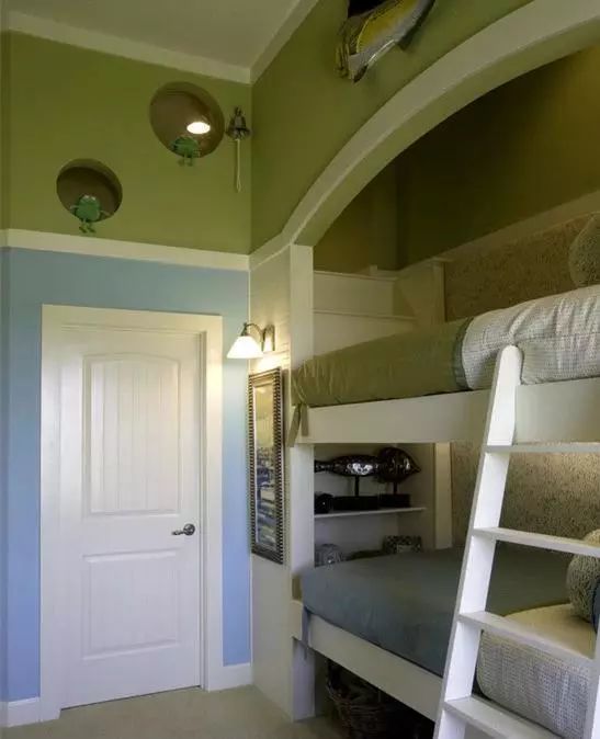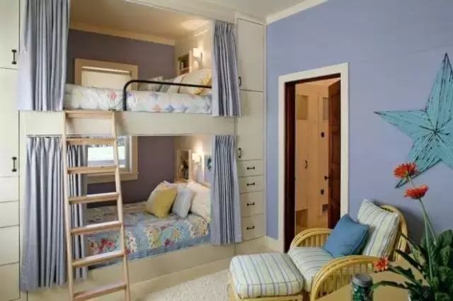 在共享房间里,最大的问题可能是孩子们可能没有隐私空间。为了避免战争,也为了孩子们可以一定程度上享受一下不受自己兄弟姐妹打扰的宁静,给他们安排一个安静的小角落也是很有必要的。带有书架的半墙,有储藏选择的床头柜,甚至一个巧妙放置的窗帘都能派到大用场。但确保这些空间分割物是灵活的,可以在需要时移出,它给你更多的重新装饰选项。