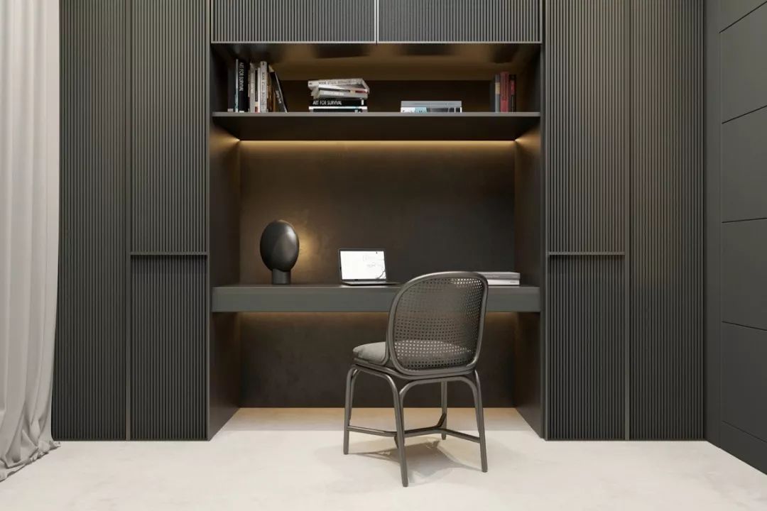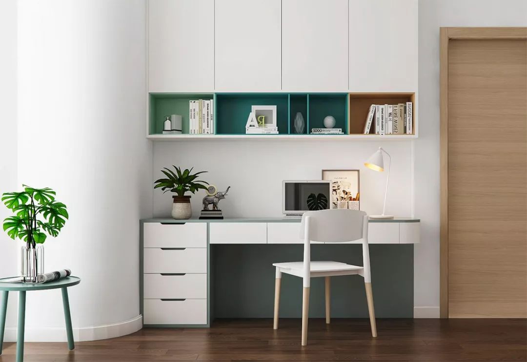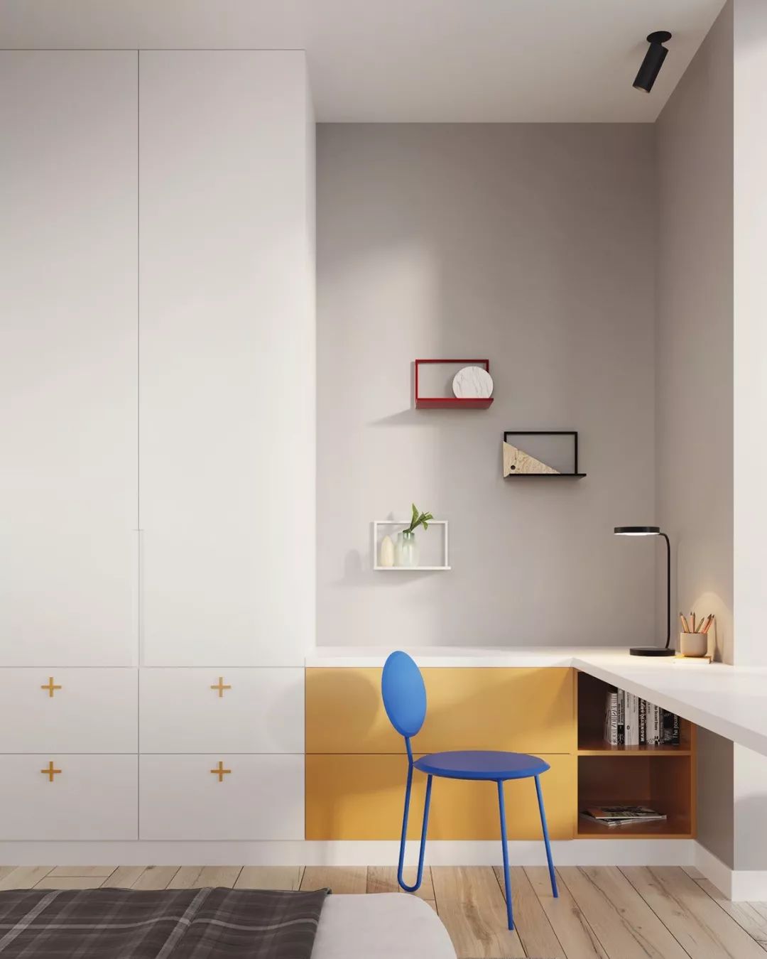 如果空间有限,可以考虑巧妙地利用柜子之间的空隙。这样自然形成一个凹进去的空间,嵌入隔板或是书桌,再加入壁灯,就大功告成了。