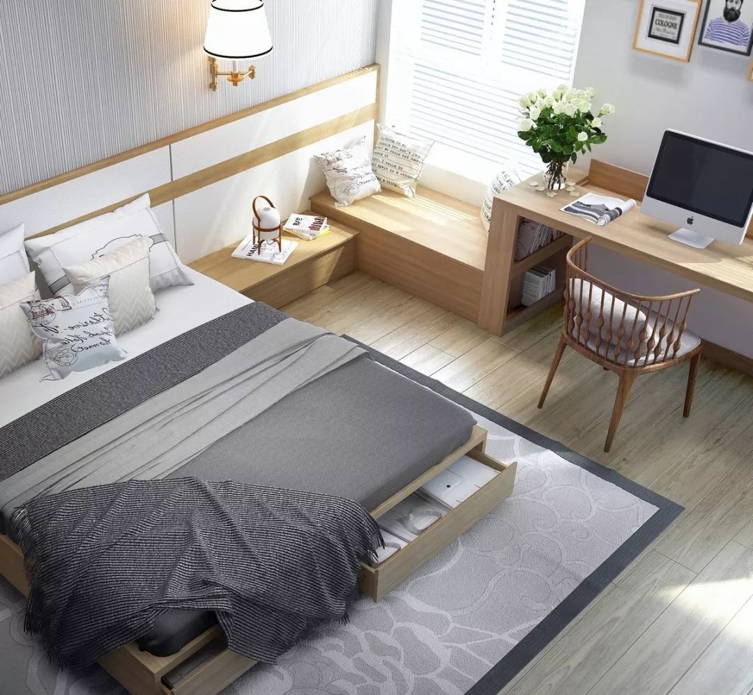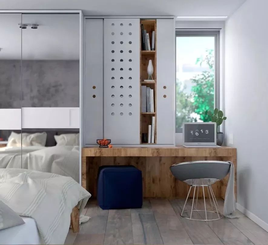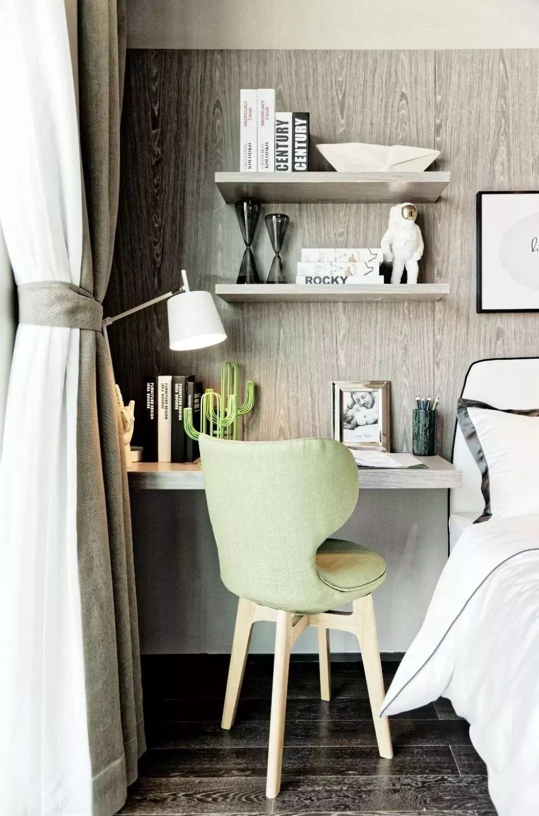 其实,卧室可以省略一个床头柜。在床头位置设计一款小书桌,既能办公,还可以当梳妆台使用。450mm以上的进深,就能将手臂放到桌面来操作电脑,桌下放腿的空间也足够宽敞。