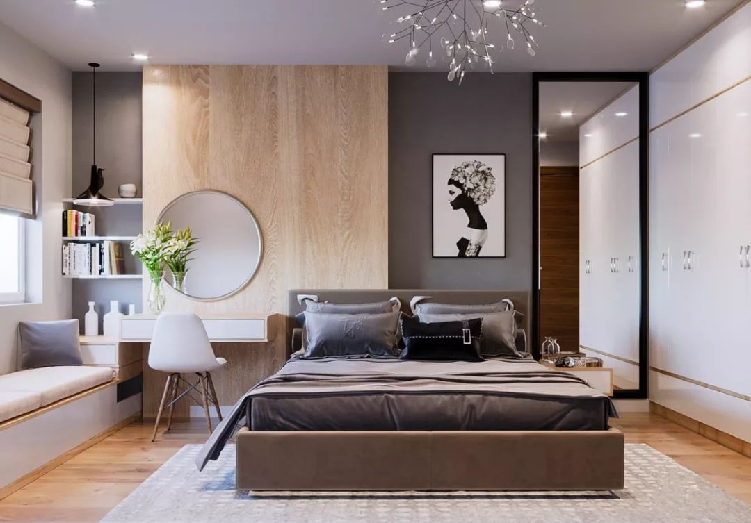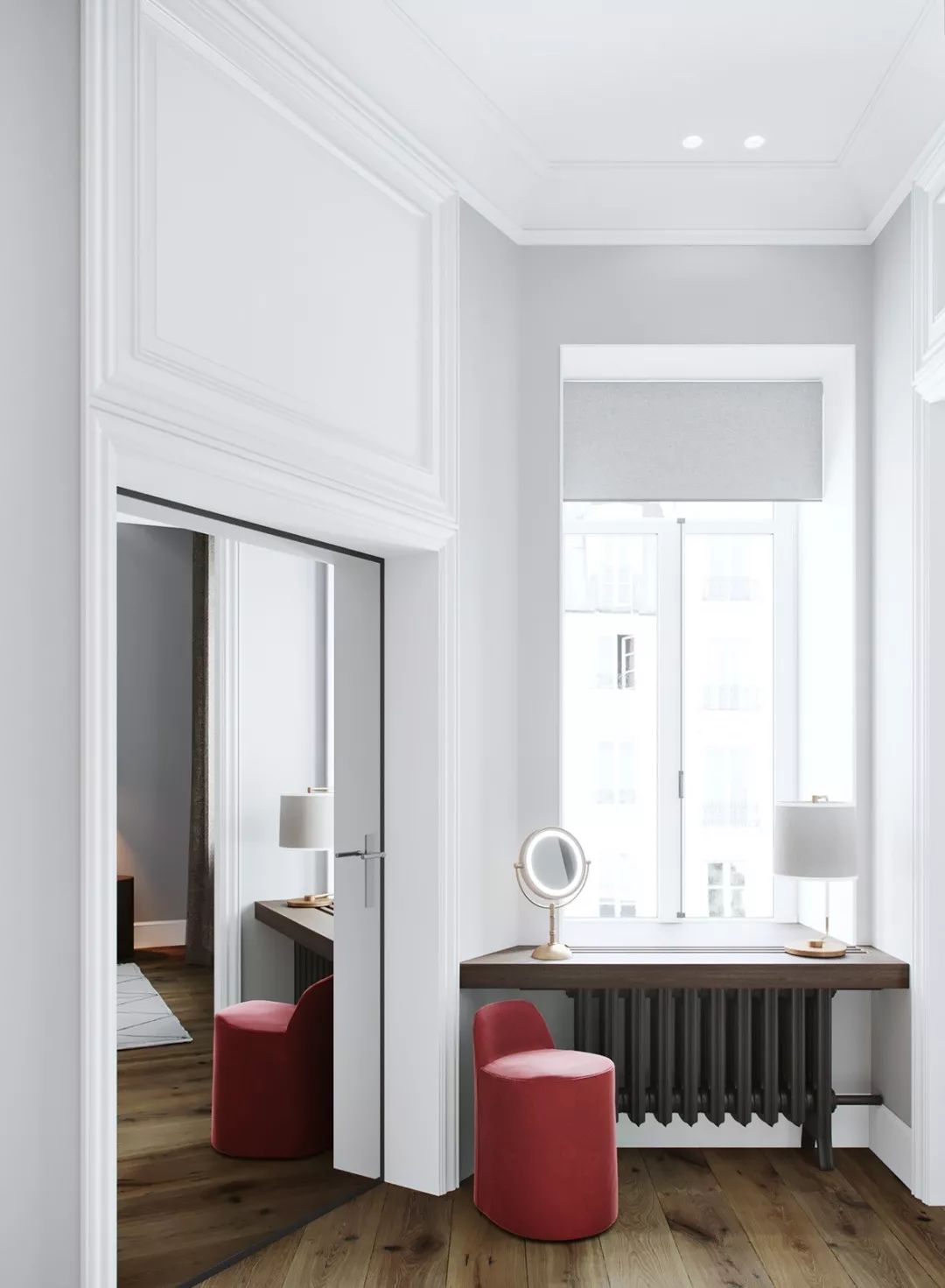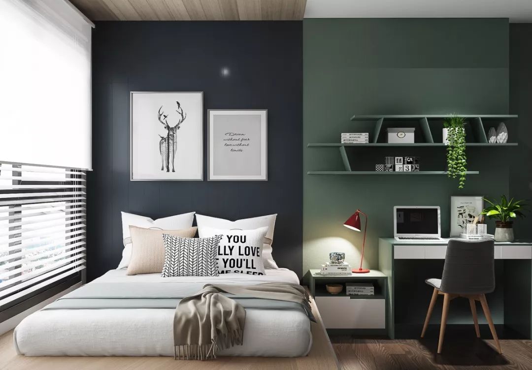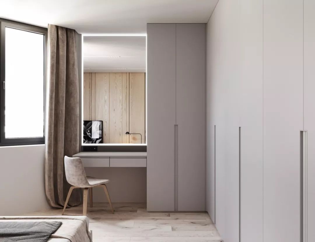 其实,卧室可以省略一个床头柜。在床头位置设计一款小书桌,既能办公,还可以当梳妆台使用。450mm以上的进深,就能将手臂放到桌面来操作电脑,桌下放腿的空间也足够宽敞。