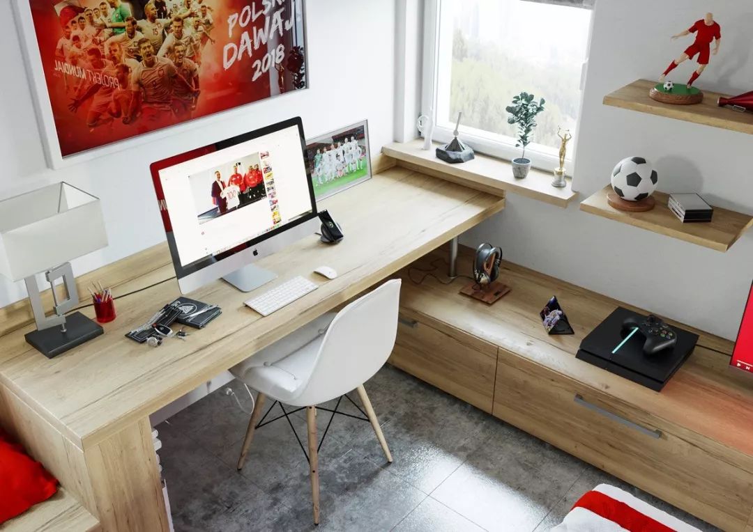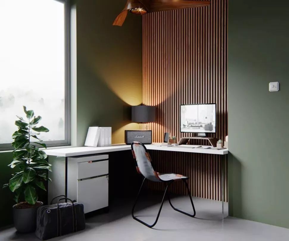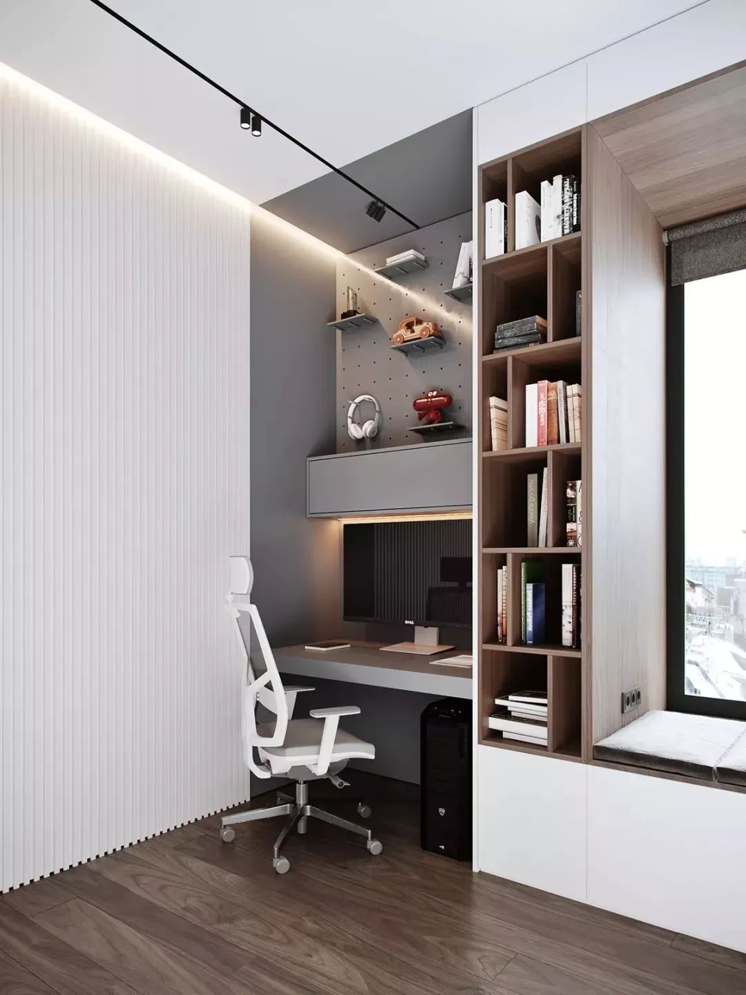 单张的书桌已不能满足多重的使用需求,在转角的位置打造一个书柜、书桌一体的设计, 可谓非常实用了。