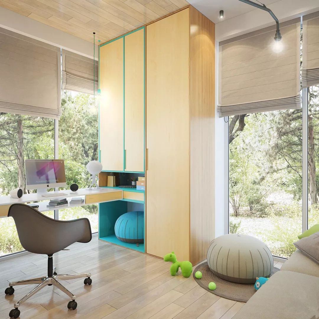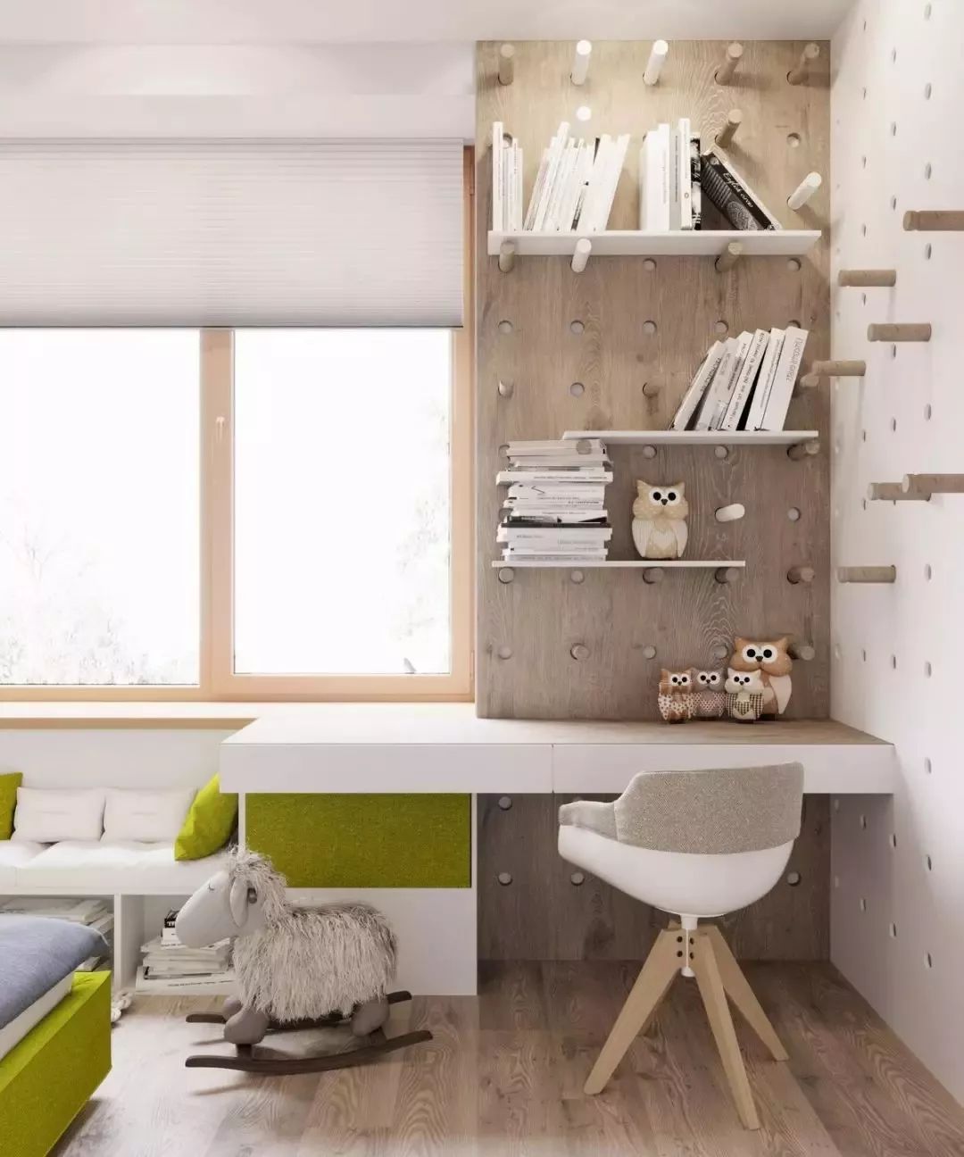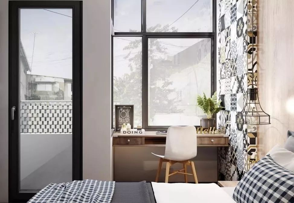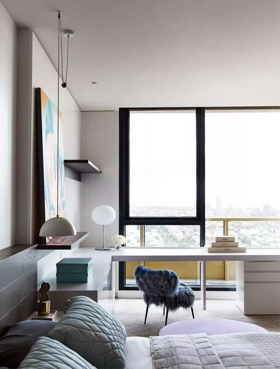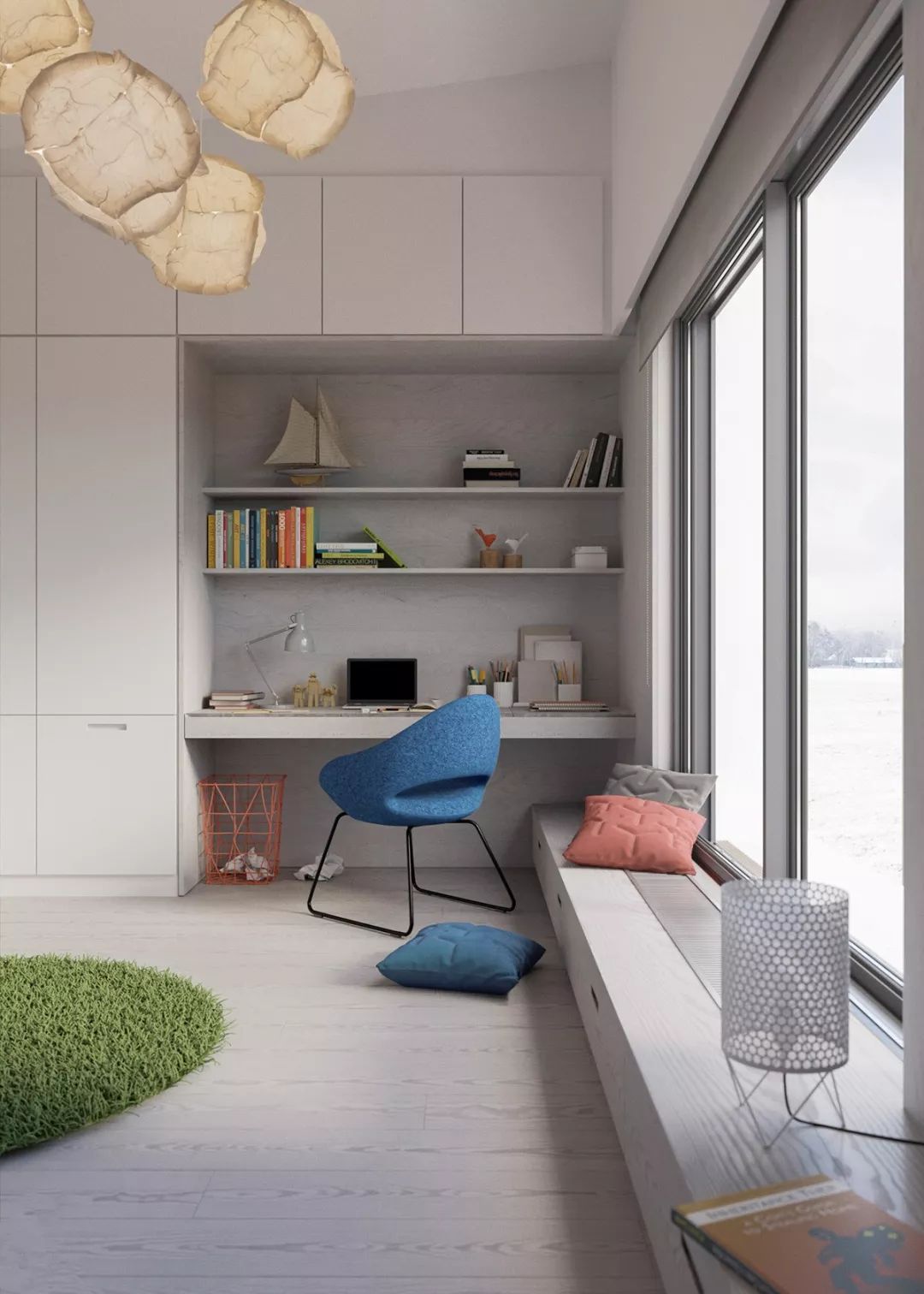 直接面对窗户,最大的好处就是视野广阔,获得足够的光照;如果窗外再有赏心悦目的景色,休息时抬头远望,就更美好了。这样一个学习和娱乐兼具的环境,创造出新的生活乐趣。