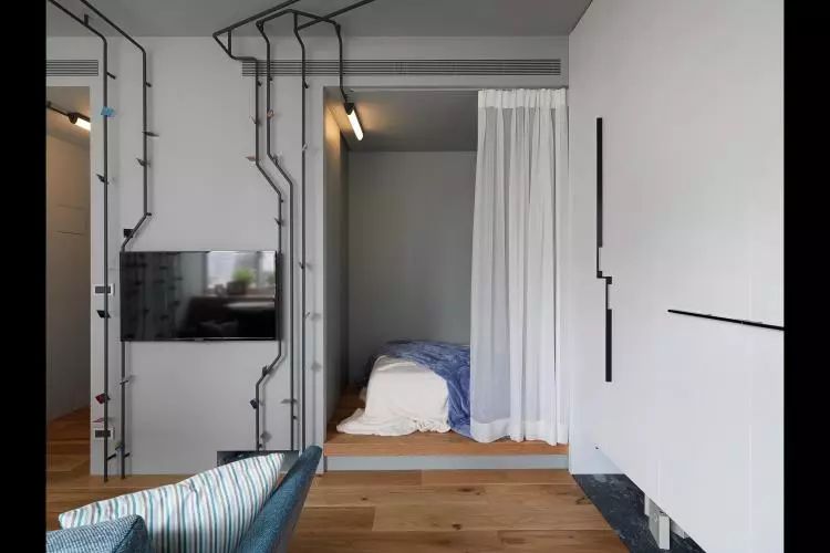 针对小空间的卧室怎么大利用?可以把地板架高一点,让睡眠区有点卧榻感,下方也能成为收纳抽屉,朋友来时,因为高度够高,地板就成为了可坐可卧的空间,多惬意。