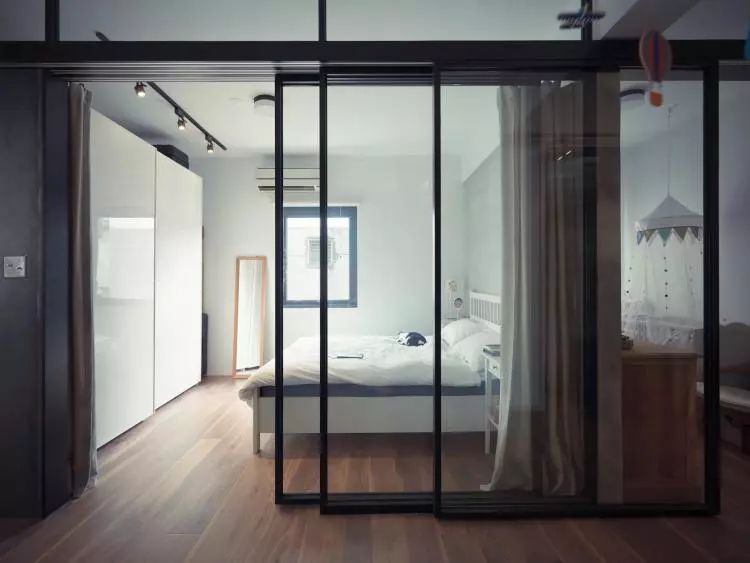 想要保持空间透亮又希望有点隐密性,铁件玻璃滑门最洽当,再补上拉帘一样能随着个人需求调整开放或封闭。