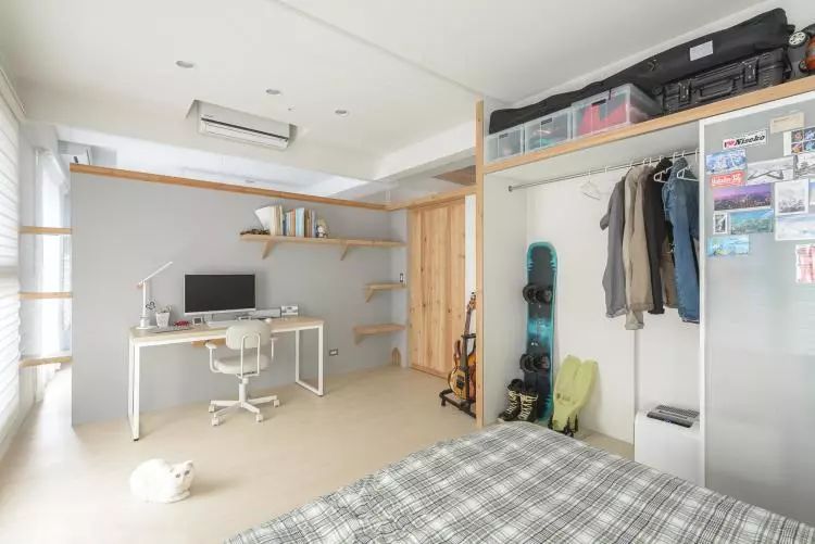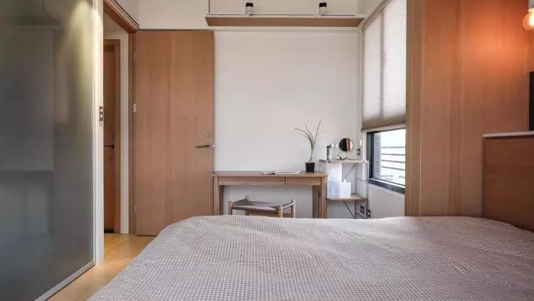 这个卧房很简单,空间彩度低,仅用塬木色调与白色浅灰色搭配而成,隔间看得到不做到天花,甚至墙面也没做满,让客厅的光线也能引入卧室。