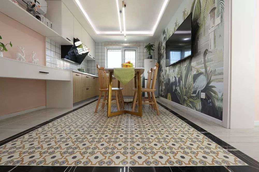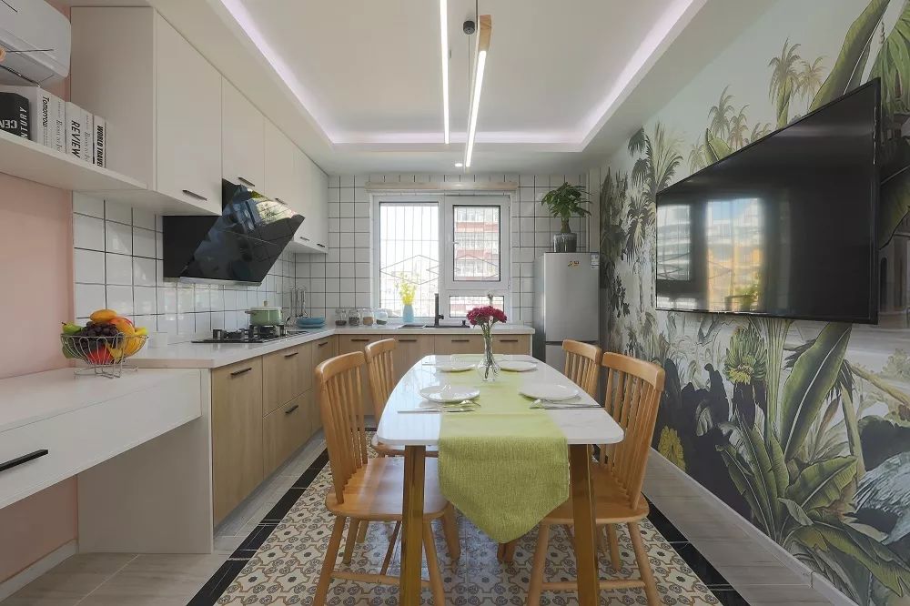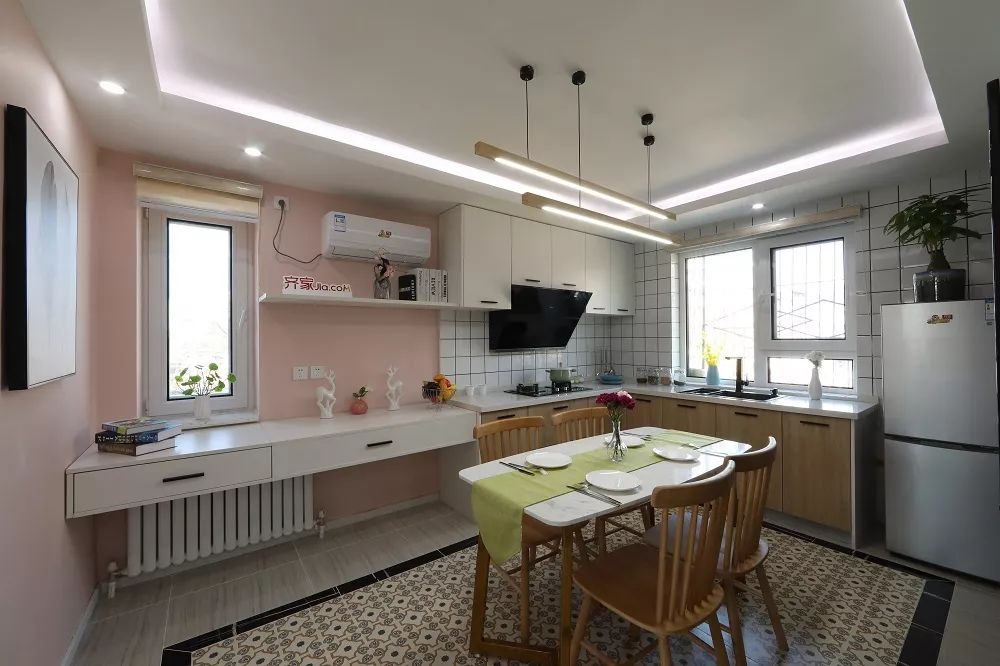 顺着玄关径直往里走,就是13㎡的开放式厨房,洗菜池、切菜区、烹饪区和备餐区呈L型分布,洁白的大理石台面、白色的壁柜、木色的橱柜,整个厨房拥有了同户型普通厨房4倍的收纳空间。