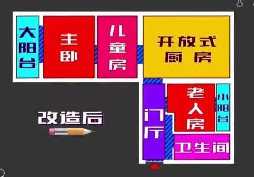 改造完成后,进门依次是玄关和实现干湿分离的卫生间、小阳台、老人房、开放式厨房、儿童房、主卧和大阳台。
