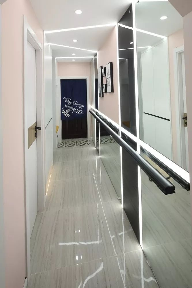 之前昏暗的小门厅被设计师改造成了玄关,墙面和顶上的灯带交织在一起,整个玄关显得格外明亮。粉色墙面配上一组装饰画,整个玄关就像是一个艺术长廊。