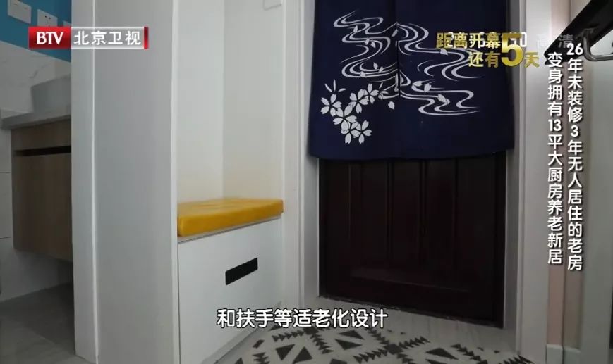 考虑到马老太太的年龄,设计师还专门在玄关增添了换鞋凳和扶手等适老化设计,进一步深化了玄关的功能。