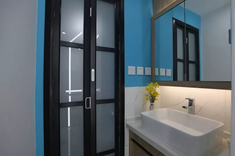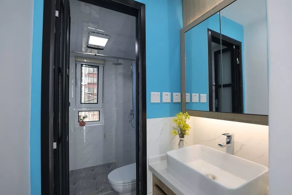 设计师在卫生间整个细节设计上,一改往日墙砖和地砖统一的铺贴方式。靠坐便器的墙面,选用了花色墙砖过渡,洗漱台上方墙面用蓝色进行点缀,营造出清新脱俗的氛围。