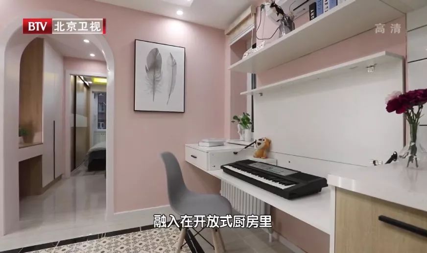练琴的区域融入在了开放式的厨房里,设计师将业主女儿芊芊的琴设计进了可开合的操作台里。当需要用的时候,只要掀开操作台即可,不用时合上就是一个写字桌,也可以是厨房的操作台,设计得非常巧妙!而且设计师还在色彩过渡上做了细节处理,这也就成为了一个独立的区域。
