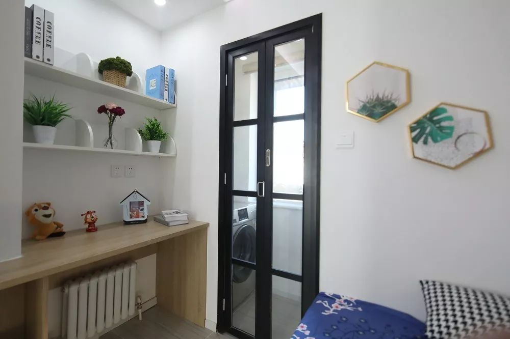 老人房还装了一扇移门,推开移门后就是一个小阳台,洗衣机被放置在了阳台上。而这扇一道移门具备了三大功能:第一,让整个房间多出了一个小阳台;其次,原来厨房的大部分管道都在小阳台区域,设计师将它们全部隐藏了起来,这样马老太太睡在里屋,既安静又安全;第三,考虑到老年人怕冷,移门的设计能在冬日里让老人房更保暖。