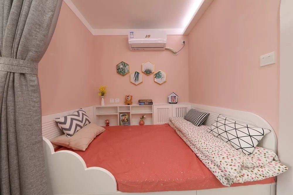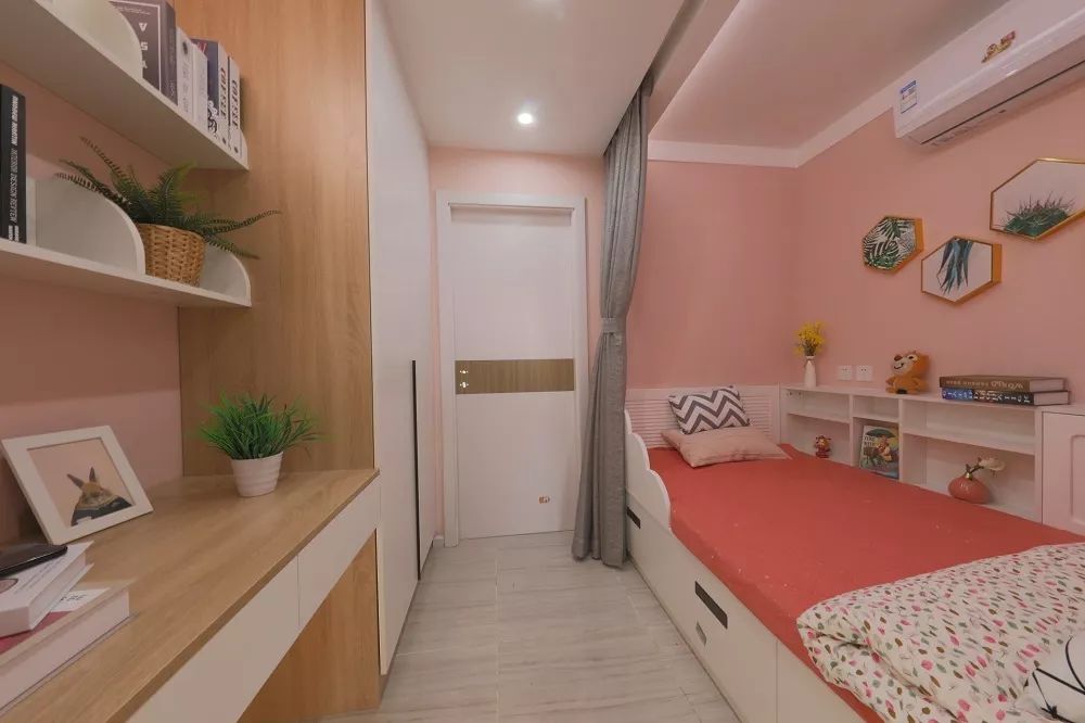 设计师采用了粉色墙漆,营造出一种梦幻少女风,特殊定制的床下带有三个大抽屉。单人床、置物阁、防护板、大衣柜、写字台和书架,满足了芊芊未来学习、生活和休憩的各项需求。