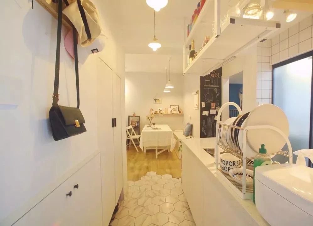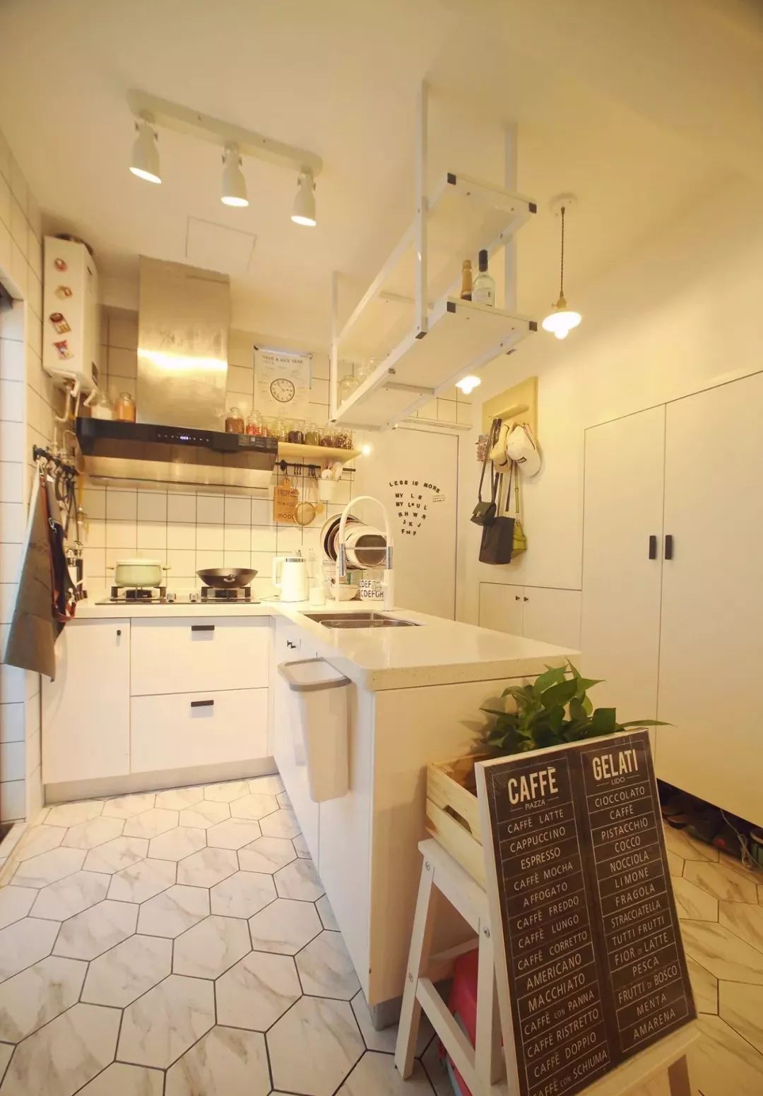 开放式的厨房,六边形的地板,切菜区域的旁边,设计了一个小型的垃圾桶,这样在清理台面的时候,就非常方便了。