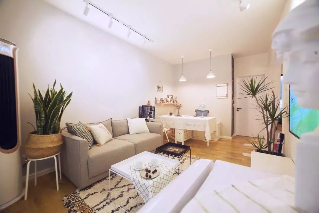 灰色的布艺沙发,有点文艺范的感觉,抛弃笨重又扎弄空间的传统茶几,采用小巧精致可随时移动位置的小茶几。