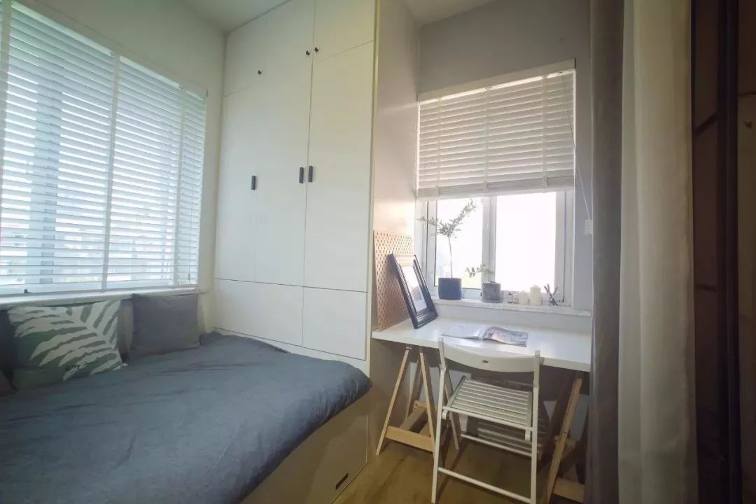 原本阳台的位置,设计了一个榻榻米,百叶窗不会遮挡光线的透入,这个空间也可以当做书房和临时客房使用。