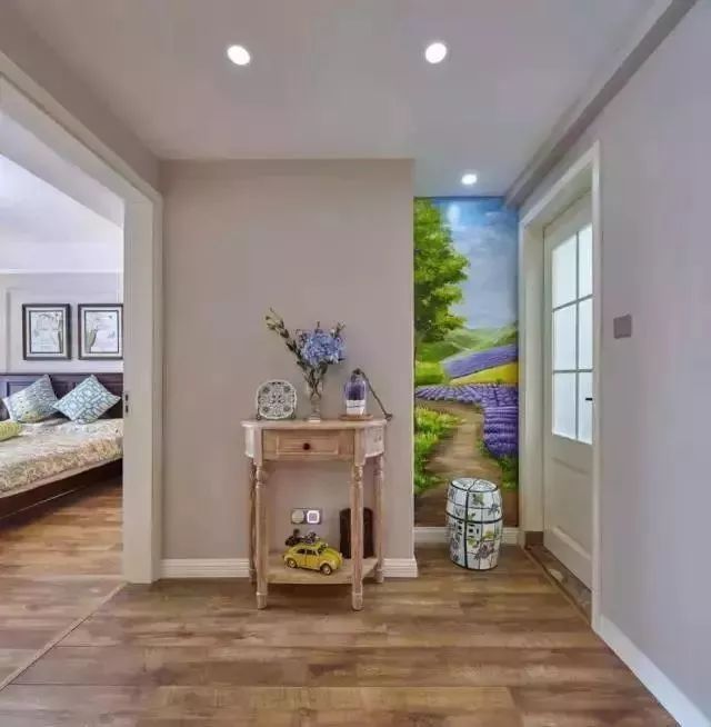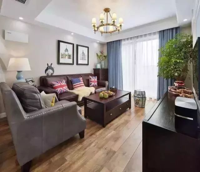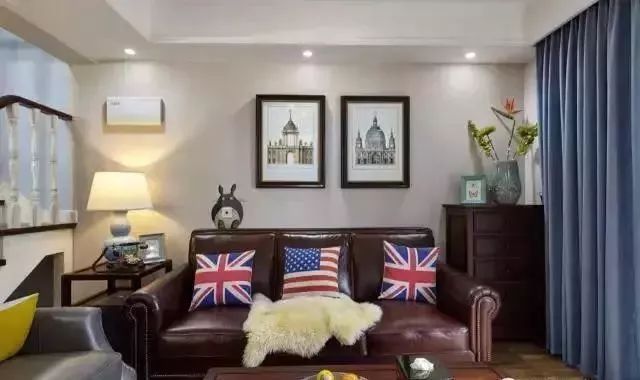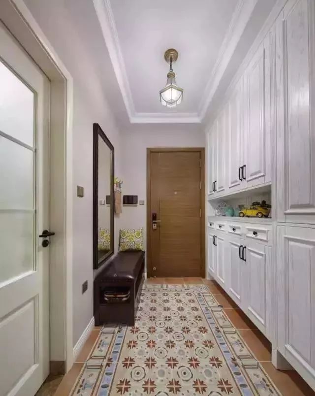 更多装修案例、家居经验欢迎关注微信公众号:jia-ms (美式装修案例精选)这是一个113平的美式风格案例,设计方面比较倾向简单,看着还有一种文艺青年的样子,大家看完成品后觉得如何。进门有一个大的玄关,打了一列收纳柜,有简单吊顶,另一边有全身镜和凳子。沙发是皮质的,比较复古的颜色,墙面以大白墙为