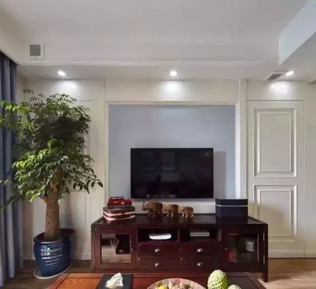 电视背景墙没有过多的装饰,比较小,女主人还把盆栽搬进来了。