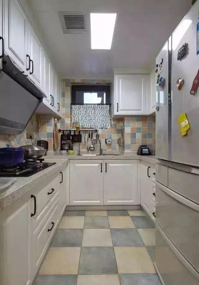 厨房地面的砖由两种色彩组成,收纳柜统一的白色。