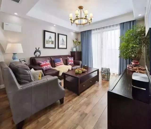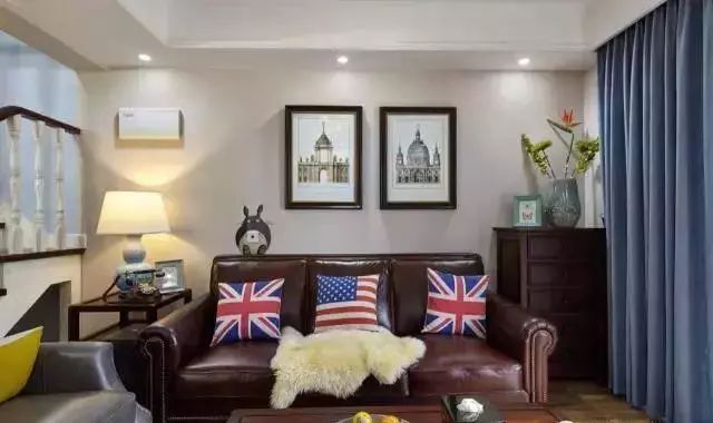 沙发是皮质的,比较复古的颜色,墙面以大白墙为主,木质地板