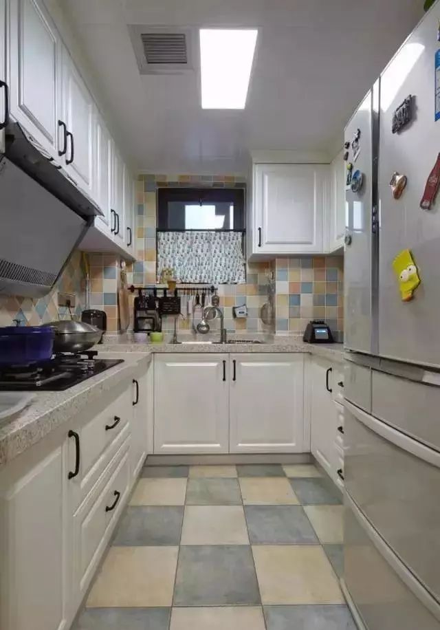 厨房地面的砖由两种色彩组成,收纳柜统一的白色