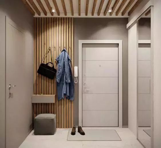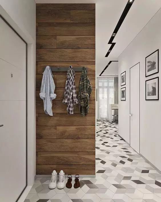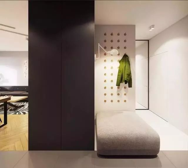 很多人下班回家后,习惯性地脱掉脏外套、脏袜子和手提包,在门厅专门设计一个,收纳外出物品的小墙,会很贴心哦!