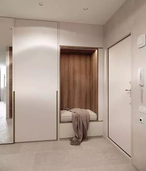 买的成品鞋柜,不仅储存量小,还占地方。根据空间位置,设计一个嵌入式的壁柜,是一个不错的选择,它可以充当一个小型衣帽间或是储物间。