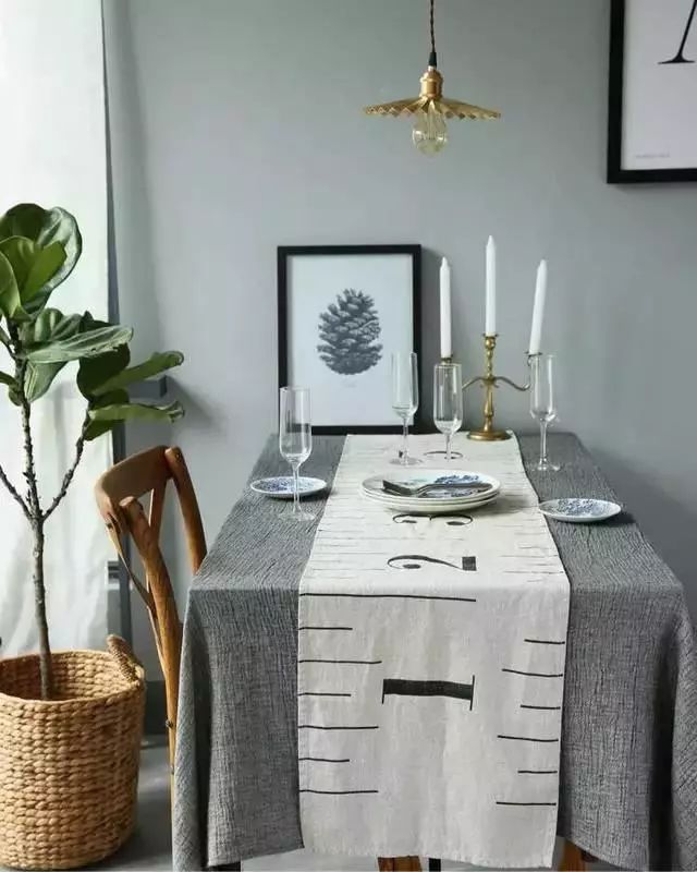 如果不想把整张餐桌遮住,可以试试桌旗。桌旗一般铺在桌子的中线上,还可以搭配餐垫使用。桌旗可以起到很好的装饰作用,让餐厅看起来更有情调。