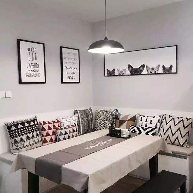 浅色系、图案简单的桌布,是最百搭的桌布。再搭配上相称的几何图形靠枕,用餐氛围瞬间不一样。