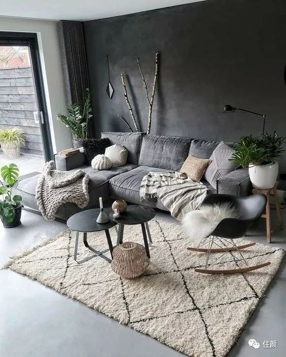 同色系的墙面和沙发太过单一?可以用浅色的地毯、绿植等来中和一下,就不会显得太过压抑,绿植和编织筐的装饰,增加层次感的同时更点缀了空间。