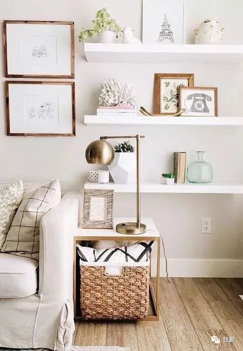 论起收纳,置物架和搁板绝对少不了,沙发背景墙没想好不如开发出来做收纳,实用性超强。