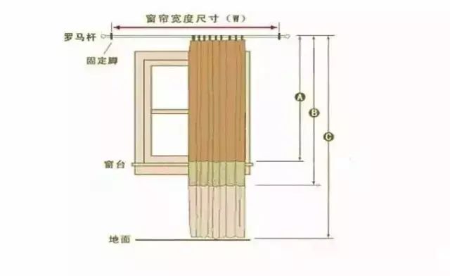 由于窗帘为褶皱形状,所以窗帘的实际宽度为测量宽度的1.5—2倍。为了凸显房间的高度,建议罗马杆(轨道)高于窗框上沿13—18cm。