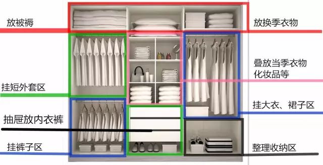 这点我在刚开始就说到了,现在再提一次,是为了具体的分配一下,像是不常用的被褥区,就适合放在顶部。叠放区就是在最中间,放当季的衣服,不用弯腰、踩凳子的去拿。挂衣区下方的抽屉、格子就适合拿来放内衣裤和袜子,分开来放,就不会乱。