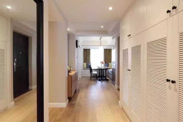 床头柜边上和入户都打了一组内嵌式柜子,床头的用来放衣服,入户那边的用来放过季的被褥。