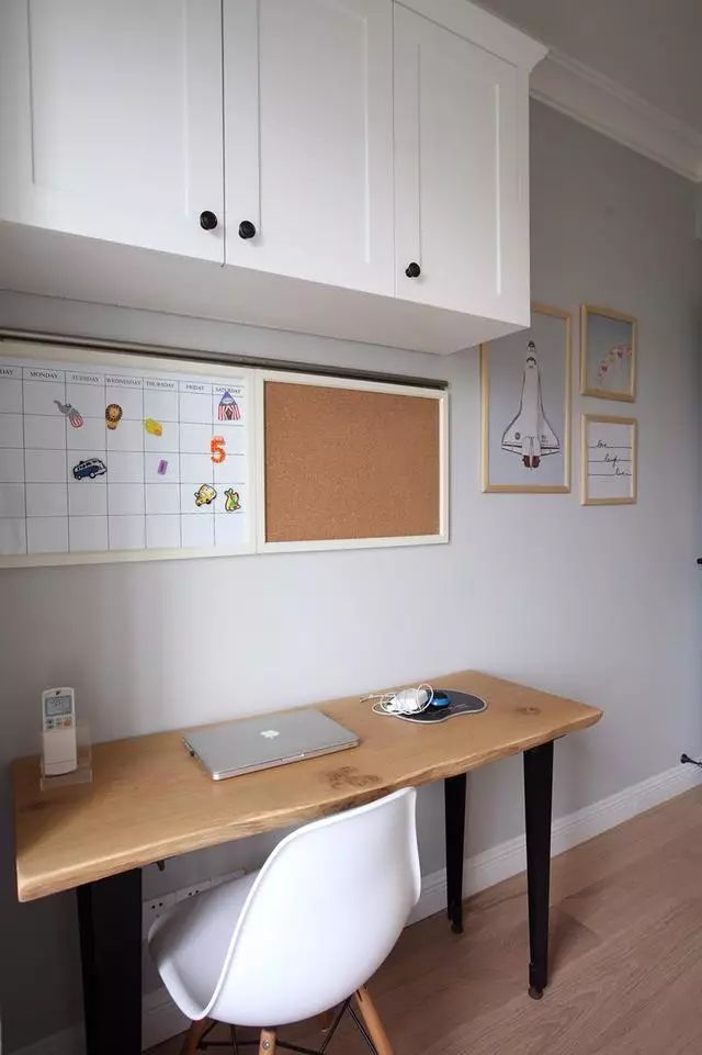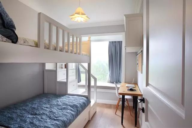墙面刷成了灰白色,搭配上白色的高低床效果挺不错的。靠窗边上做来了个简易的小书桌,还打了个吊柜。