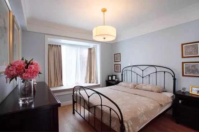 也走的石膏线,墙面刷的粉蓝色,在布置一些装饰相框,效果还不错,黑色铁艺床架和家具挺搭配的,窗帘沿着飘窗轨迹做的,感觉还不错。