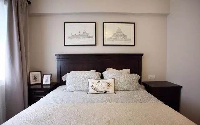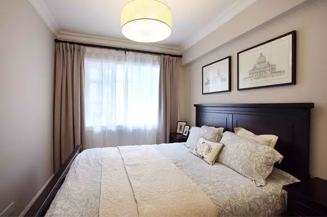装修的比较朴实一些,没有太花哨,主要是二老比较喜欢,就只能依着他们了。床头挂了两幅素描画做装饰,效果还不错。