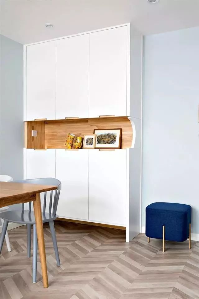 大门旁边是餐厅空间,一个金属架的蓝色布艺换鞋凳,角落的是一个底部与中部留空的鞋柜餐边柜,中间层是木质的,摆上装饰画与装饰品,显得简洁优雅好温馨。