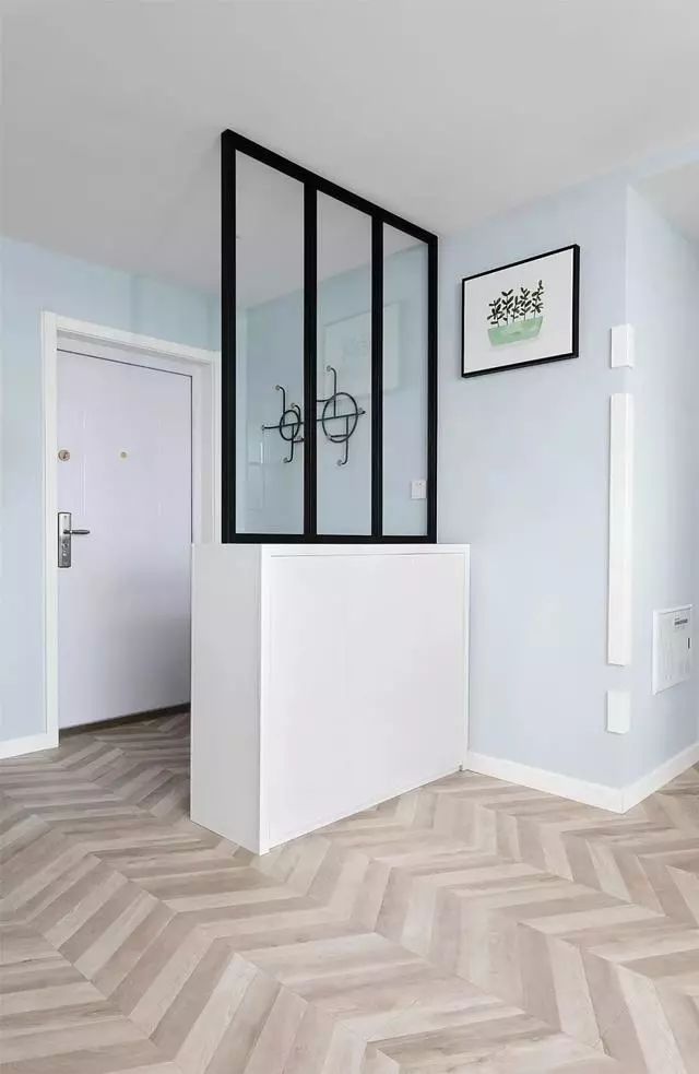 这套房子的实用面积大概63平,户型并不规则的二房,整体以清新自然的现代简约风格基础,以实用为主的空间利用,装扮出一个精致小巧的舒适之家。玄关进门大门后就是直对客餐厅的空间,为让空间私密性更强,在正对大门的位置布置上一个隔断屏风柜,底部柜子+上部玻璃的隔而不断设计,显得实用而雅致大气。餐厅大门旁边是
