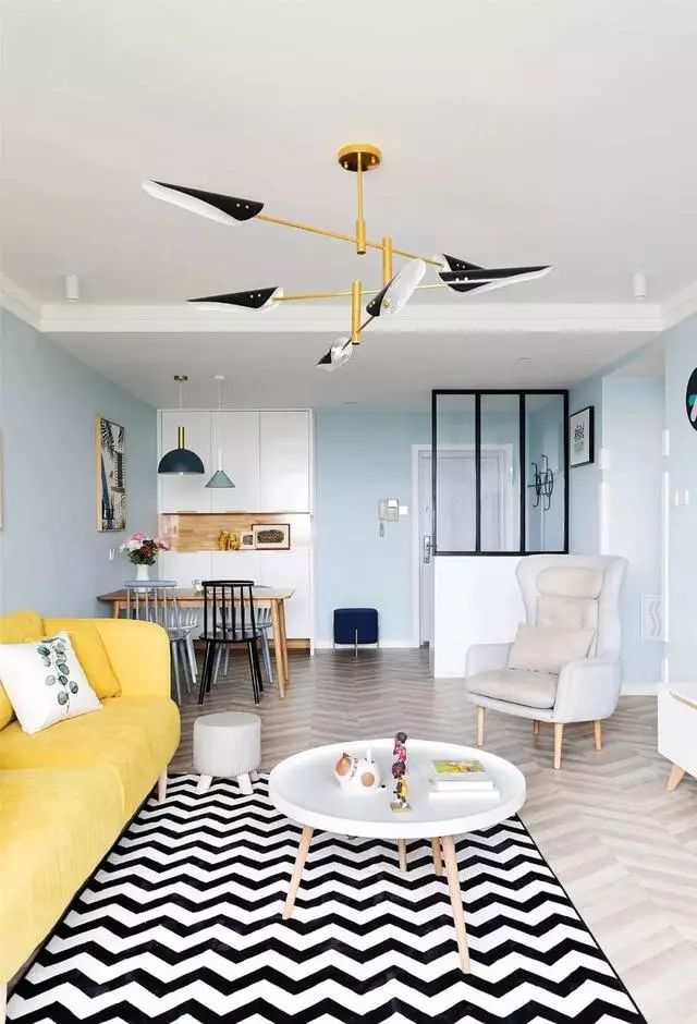 客厅的阳台打通装成休闲区,整个客厅以淡蓝色的色调,搭配黄色沙发,在冷静的基调装扮出一个活泼跳跃的空间。